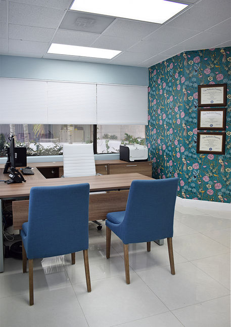 Diseño de interiores para oficina de abogada emprendedora. Nuestro trabajo consistió en tratamiento de ventanas (cortinas), pintura y terminaciones de pared (wallpaper), distribución y selección de mobiliario.